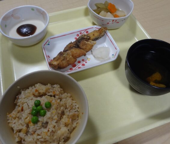 大豆の入った炊き込みご飯に、香ばしく揚がった鰤の竜田揚げが良く合い、みなさんにとても喜んでいただきました。